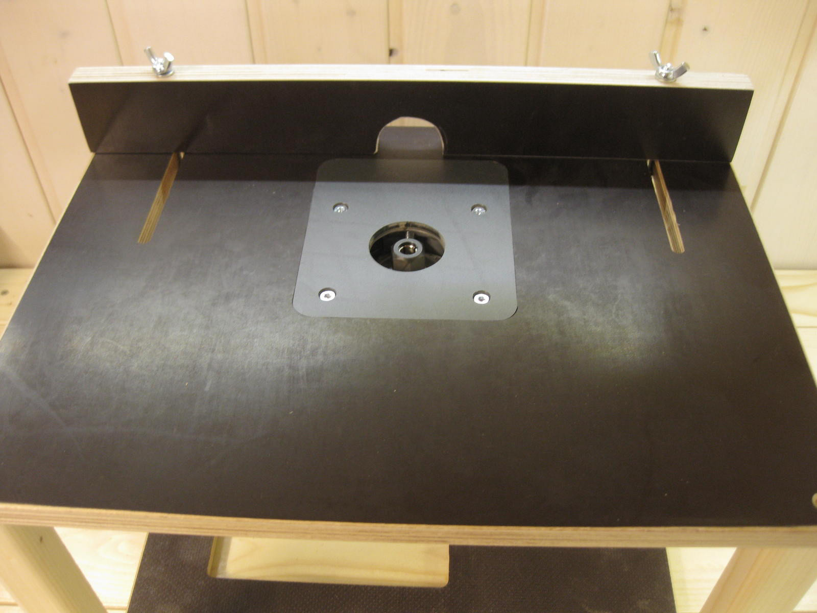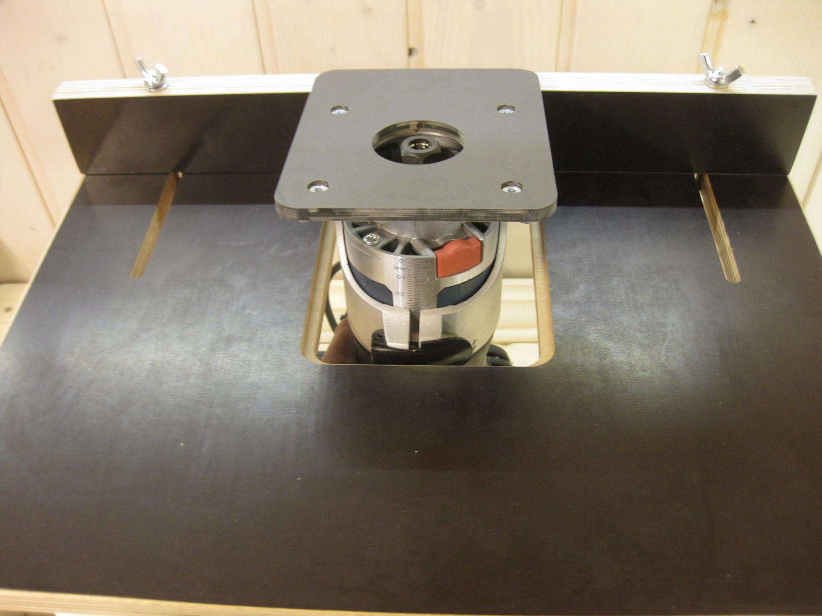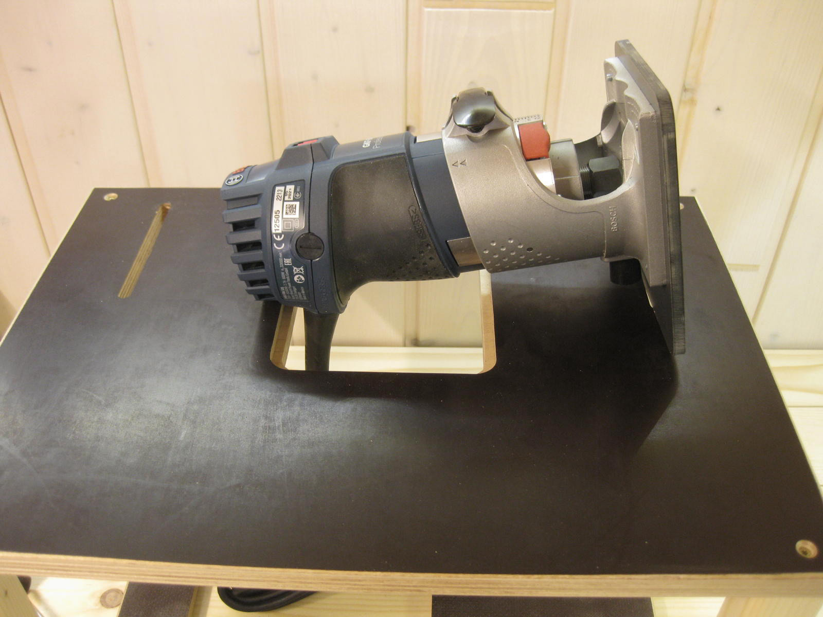 Eine weitere Befestigung ist nicht nötig, da die Fräsmaschine spielfrei in der Siebdruckplatte liegt. Frästisch mit einer Schraubzwinge auf der Werkbank oder wo anders fixieren.