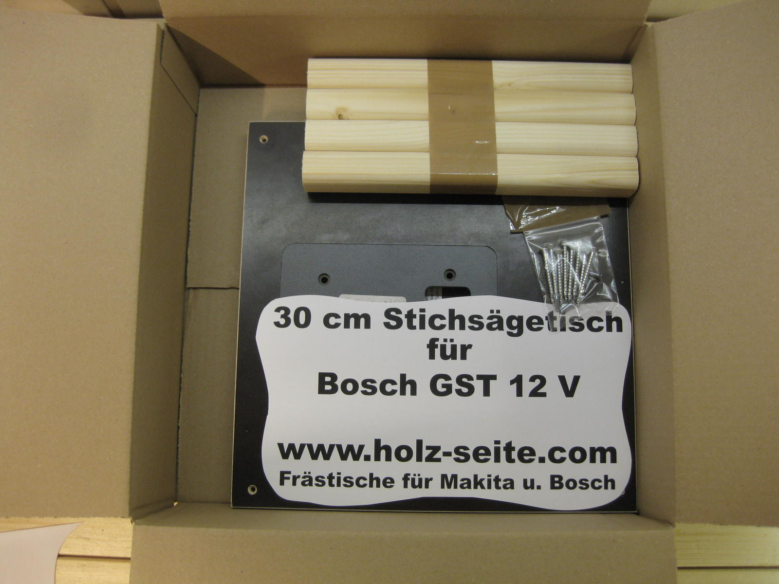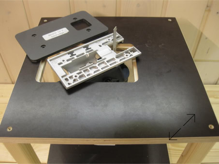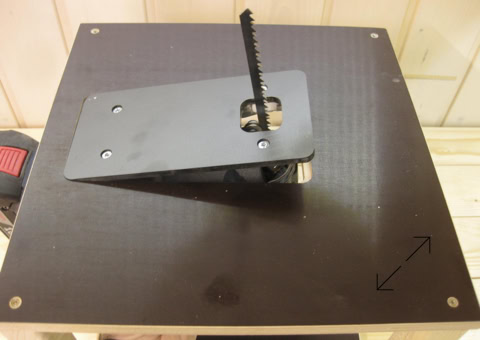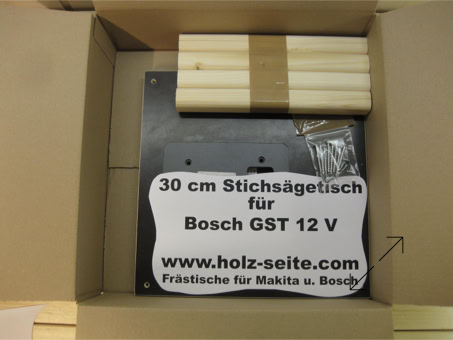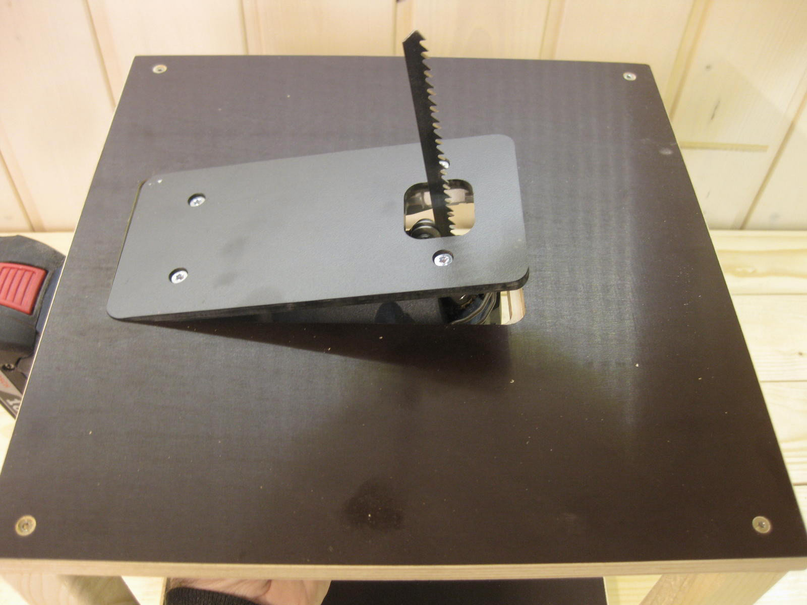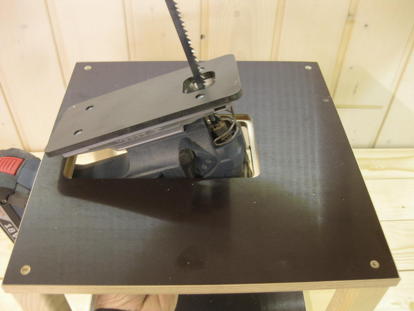 Sägetisch mit einer Schraubzwinge auf der Werkbank fixieren. Original ABS-Platte gegen die erworbene austauschen, dann die Stichsäge von oben in die Platte einlegen. Eine weitere Befestigung ist nicht nötig, da die Stichsäge spielfrei in der Siebdruckplatte liegt.