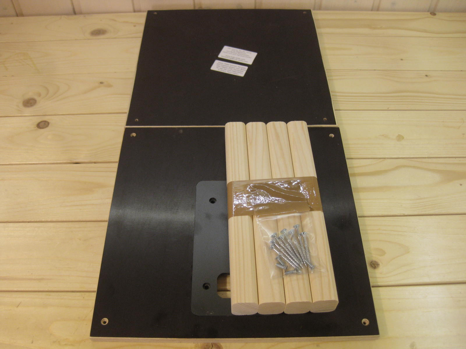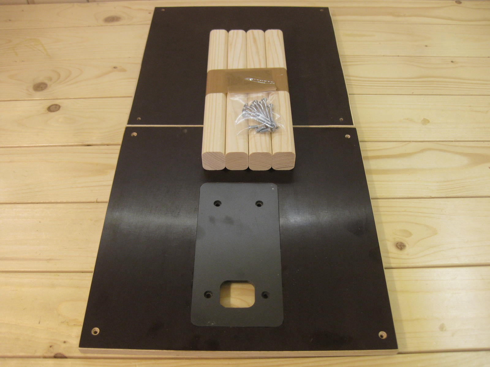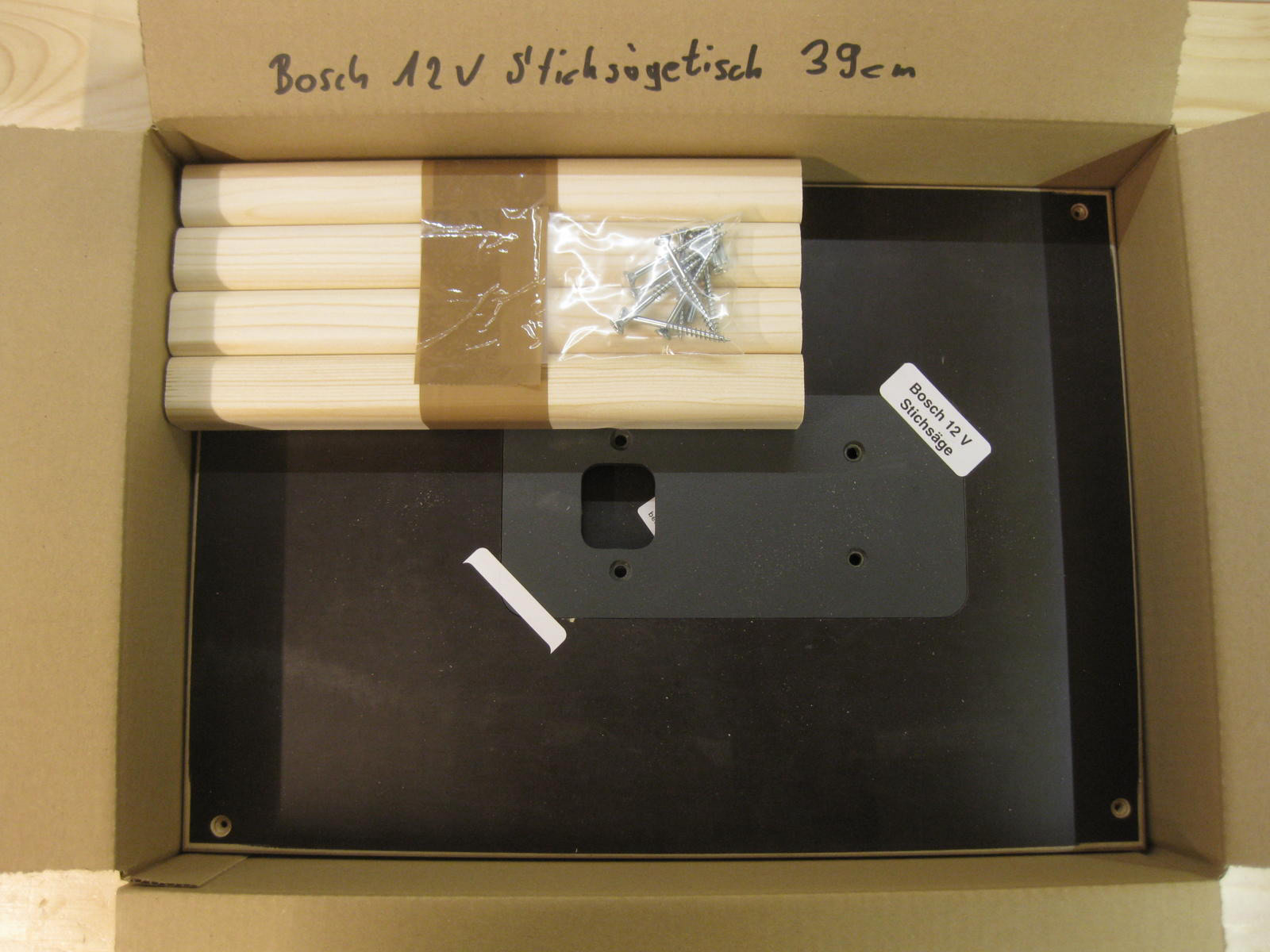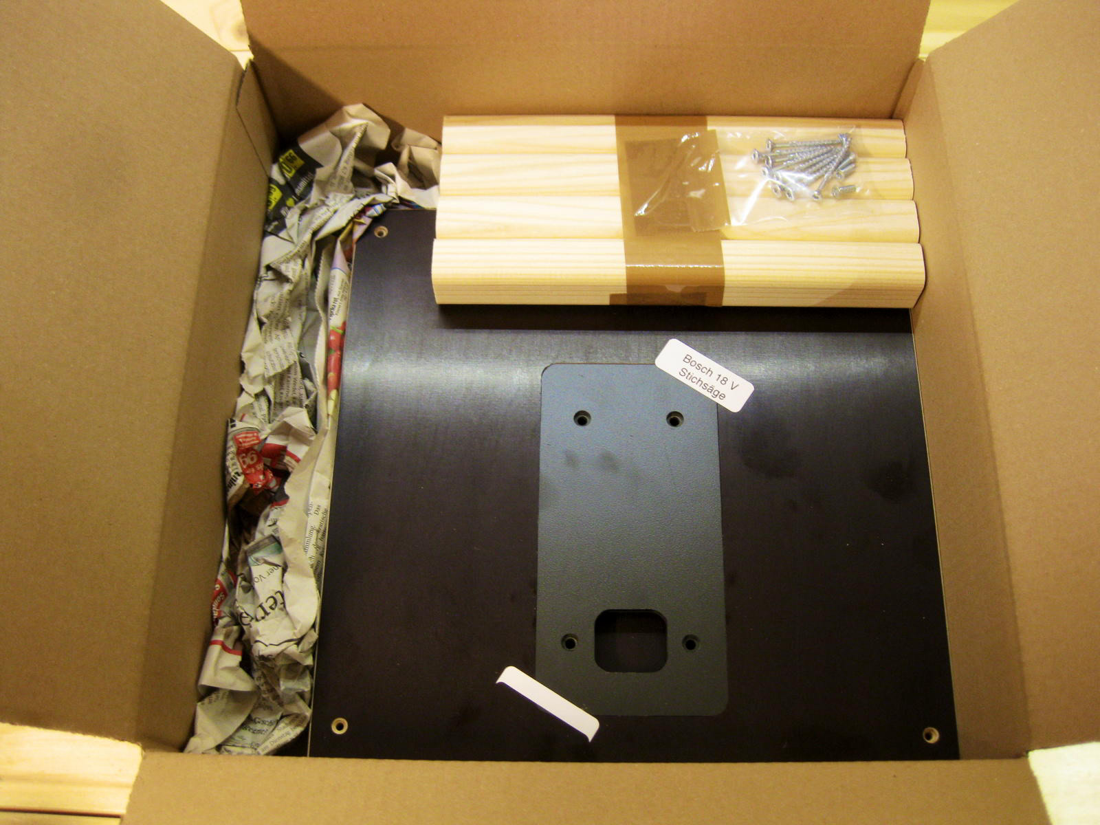Sägetisch mit einer Schraubzwinge auf der Werkbank fixieren. Original ABS-Platte gegen die erworbene austauschen, dann die Stichsäge von oben in die Platte einlegen. Eine weitere Befestigung ist nicht nötig, da die Stichsäge spielfrei in der Siebdruckplatte liegt.