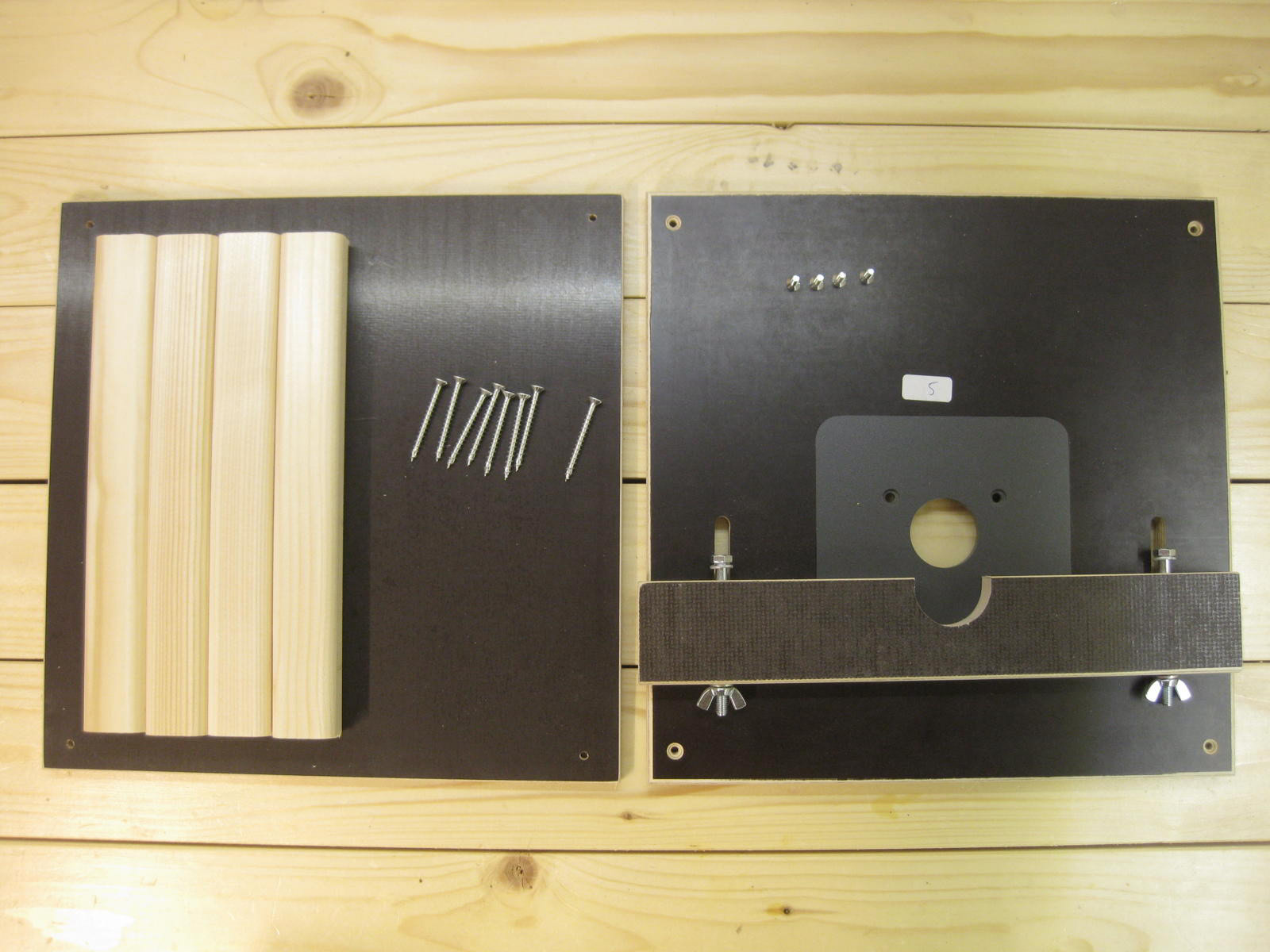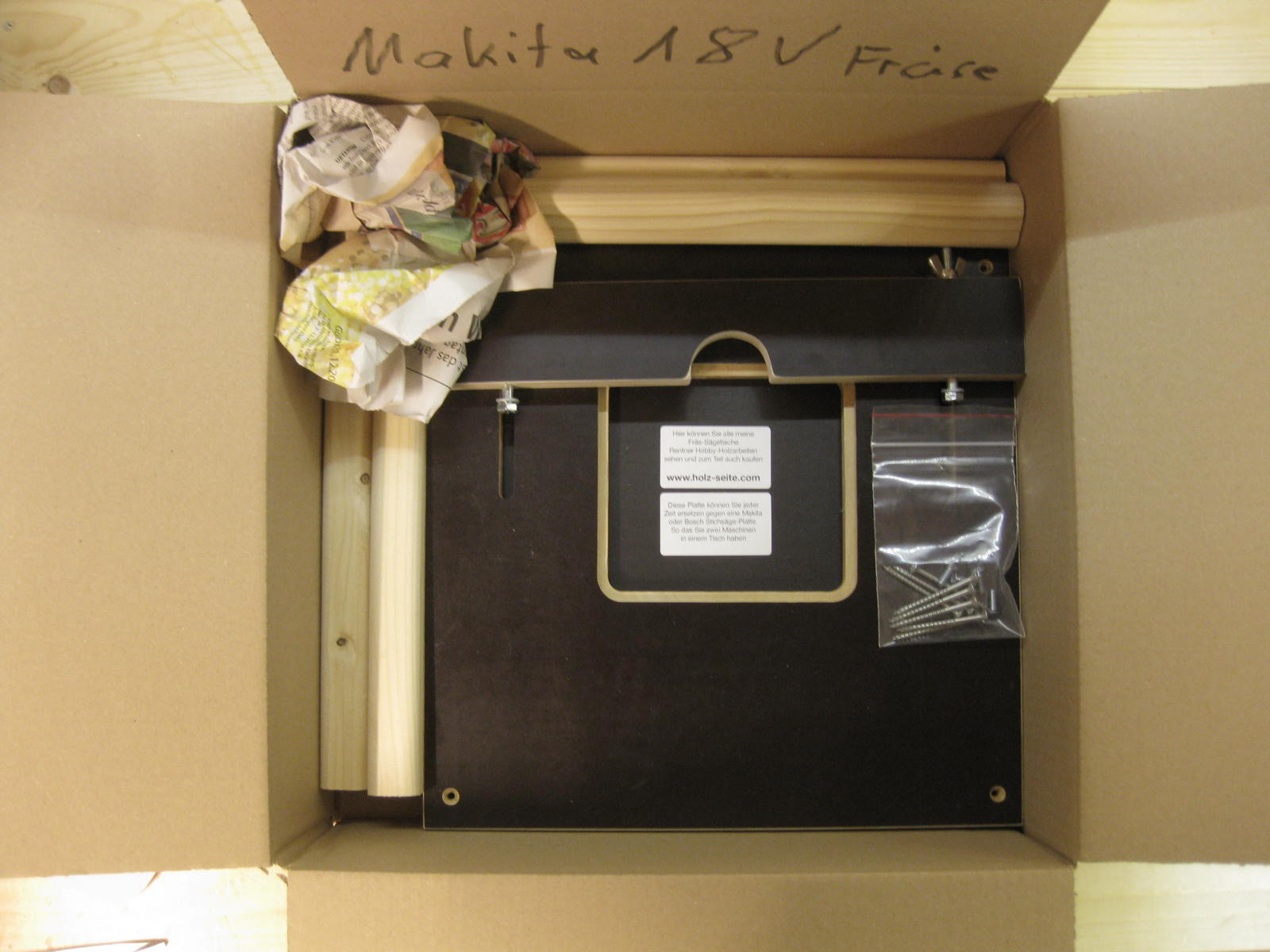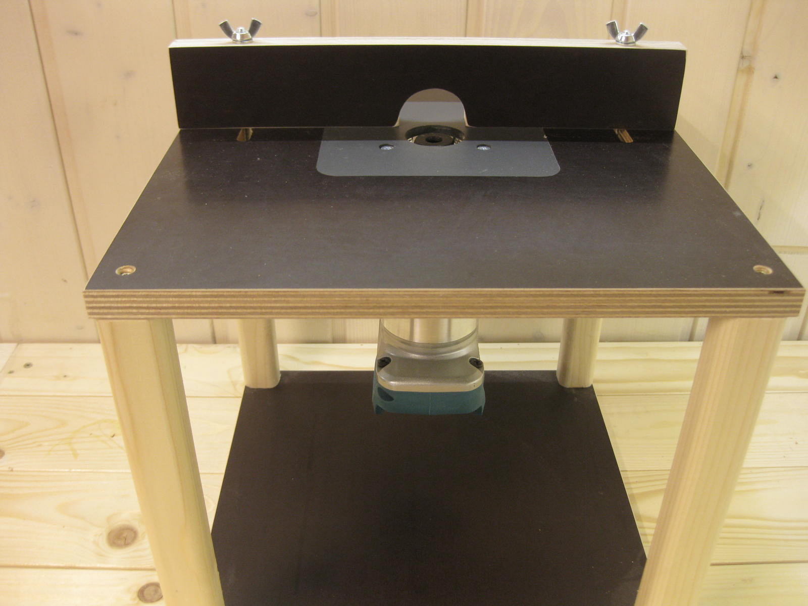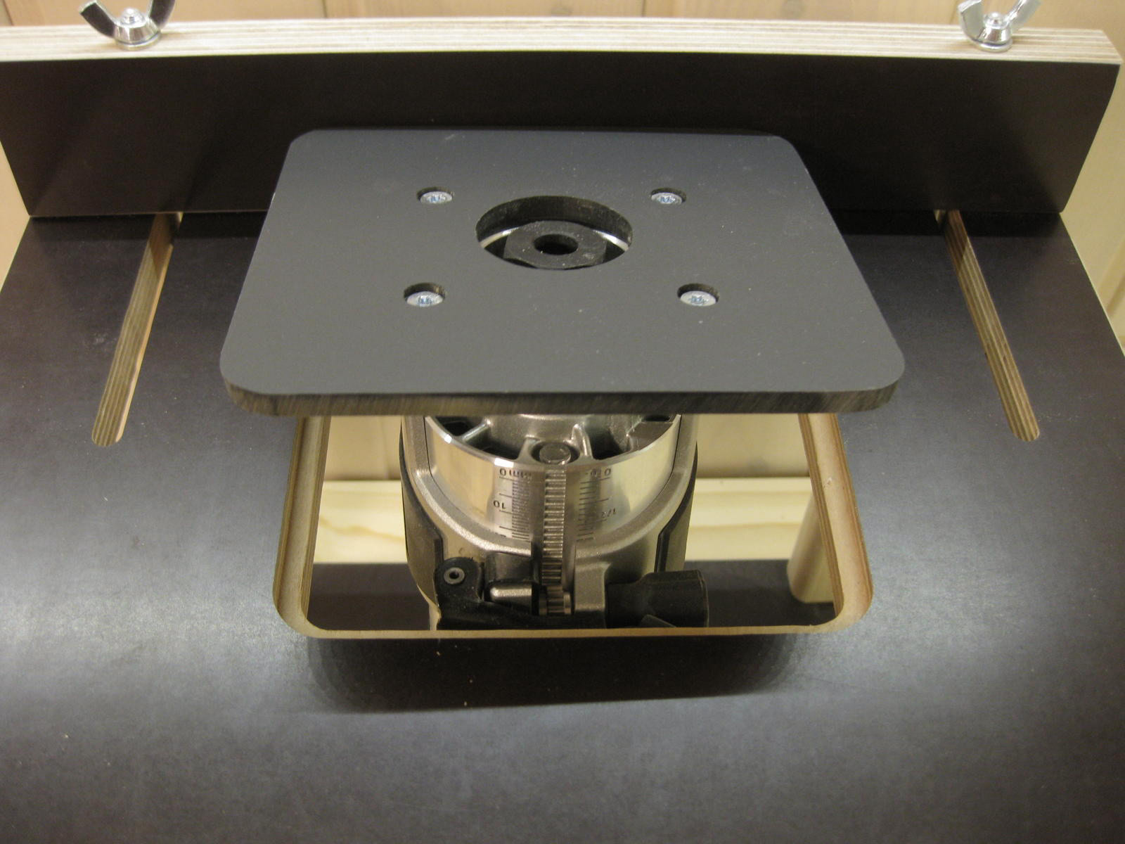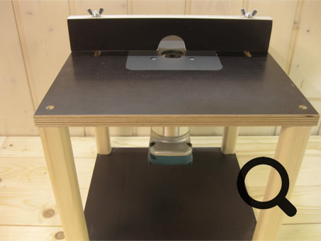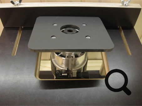 Frästisch mit einer Schraubzwinge auf der Werkbank fixieren. Original-ABS-Platte gegen die erworbene austauschen, dann die Fräsmaschine von oben in die Platte einlegen. Eine weitere Befestigung ist nicht nötig, da die Fräsmaschine spielfrei in der Siebdruckplatte liegt.