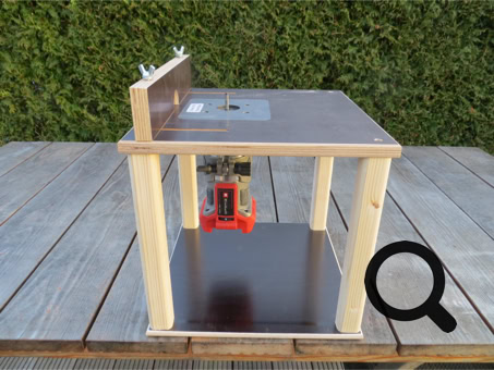 Eine weitere Befestigung ist nicht nötig, da die Fräsmaschine spielfrei in der Siebdruckplatte liegt. Frästisch mit einer Schraubzwinge auf der Werkbank oder wo anders fixieren.