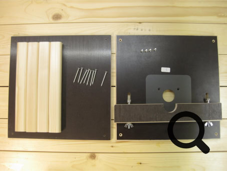 Frästisch mit einer Schraubzwinge auf der Werkbank fixieren. Original-ABS-Platte gegen die erworbene austauschen, dann die Fräsmaschine von oben in die Platte einlegen. Eine weitere Befestigung ist nicht nötig, da die Fräsmaschine spielfrei in der Siebdruckplatte liegt.